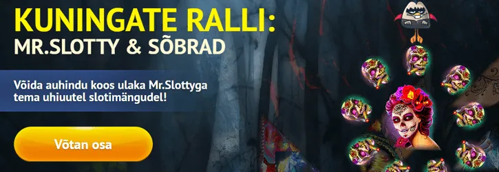 Juba täna saad Mr. Slotty mängud ära proovida ning kes teab, võib-olla kujunevad need just sinu lemmikuteks!? Võta osa Kingswini Kuningate Rallist: “MR.SLOTTY & SÕBRAD” panustades Mr.Slotty” kategooria mängudes ja võid saada osa 1,000€ ja 1,000 tasuta spinnist.