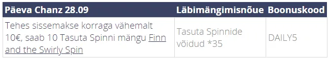 Tasuta spinne ja rahalisi preemiaid saad 24.09-11.10.2018. Lihtsalt hoia silm peal, mis on päevaülesanne, kasuta õiget boonuskoodi ja tee nõutud summas sissemakse. Nii lihtne see ongi!