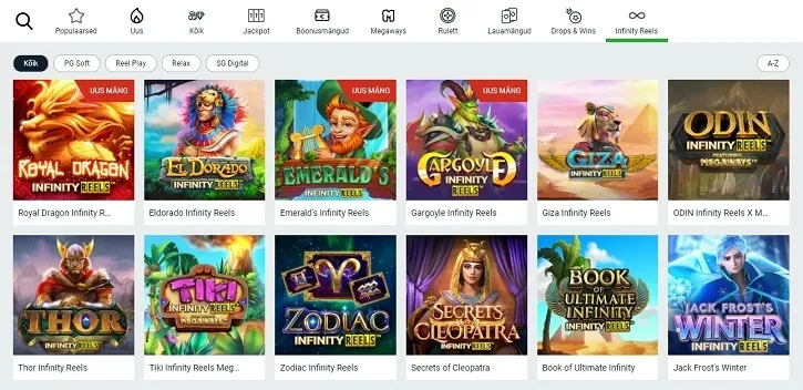 Optibet kasiinos on Infinity Reels ainulaadsed mängud koondatud eraldi kategooria alla. Leia oma lemmik kasiino lehel ja pane mängu vähemalt 200€. Auhind? 5×1€ WinSpinni!