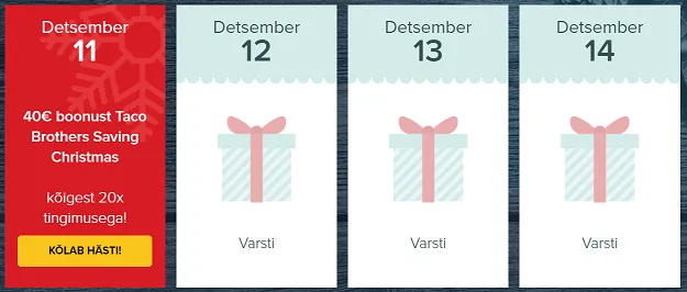 Täna 11. detsembril on neil välja pakkuda kampaania, kus 20€ sissemakse puhul saad 100% boonusraha oma deposiidile juurde. Et boonusest osa saada tuleb kasutada sissemakseks koodi TACOXMAS Kopeeritud . Läbimängimistingimus on antud boonuse puhul vaid 20 korda ning seda saab ära kasutada vaid slote mängides. Pakkumist saab kasutada üks mängija vaid üks kord.