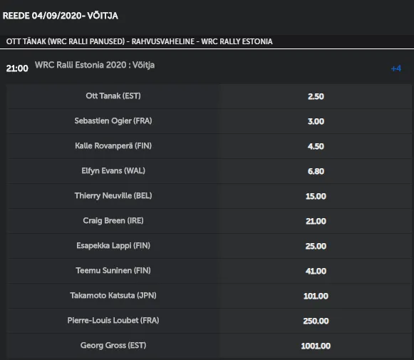 Eesti spordi läbi aegade üks suursündmusi on kohe-kohe algamas! Juba 4. septembril saab avapaugu kauaoodatud WRC Rally Estonia ja Betsafe spordiennustus paneb sellel puhul välja kõigile riskivabu panuseid. Vali ise, kas tahad peost osa saada 10-, 20- või 50 eurot riskivaba panusega ja võida koos Otiga kodustel teedel!
