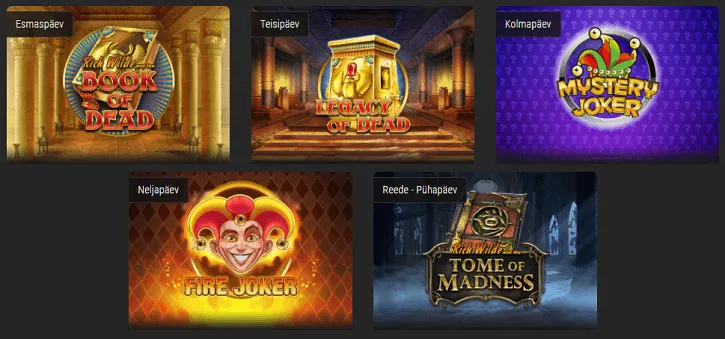 Vaata missioonide kirjeldusi Coolbet boonuste lehel, täida ülesanne ja saad oma preemia kohe kätte! Ja nii iga päev. Näide: tee 25€ sissemakse ja saad 50 tasuta keerutust.