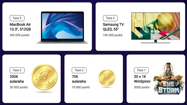Iga mängu pandud euro eest slottidel saad punkti. Live kasiinos, lauamängudel või Betgames mängudel iga euro eest 0,3 punkti. Täpne auhindade struktuur on välja toodud Optibet boonuspakkumiste lehel. Igal tasemel on järjest väärtuslikum preemia.