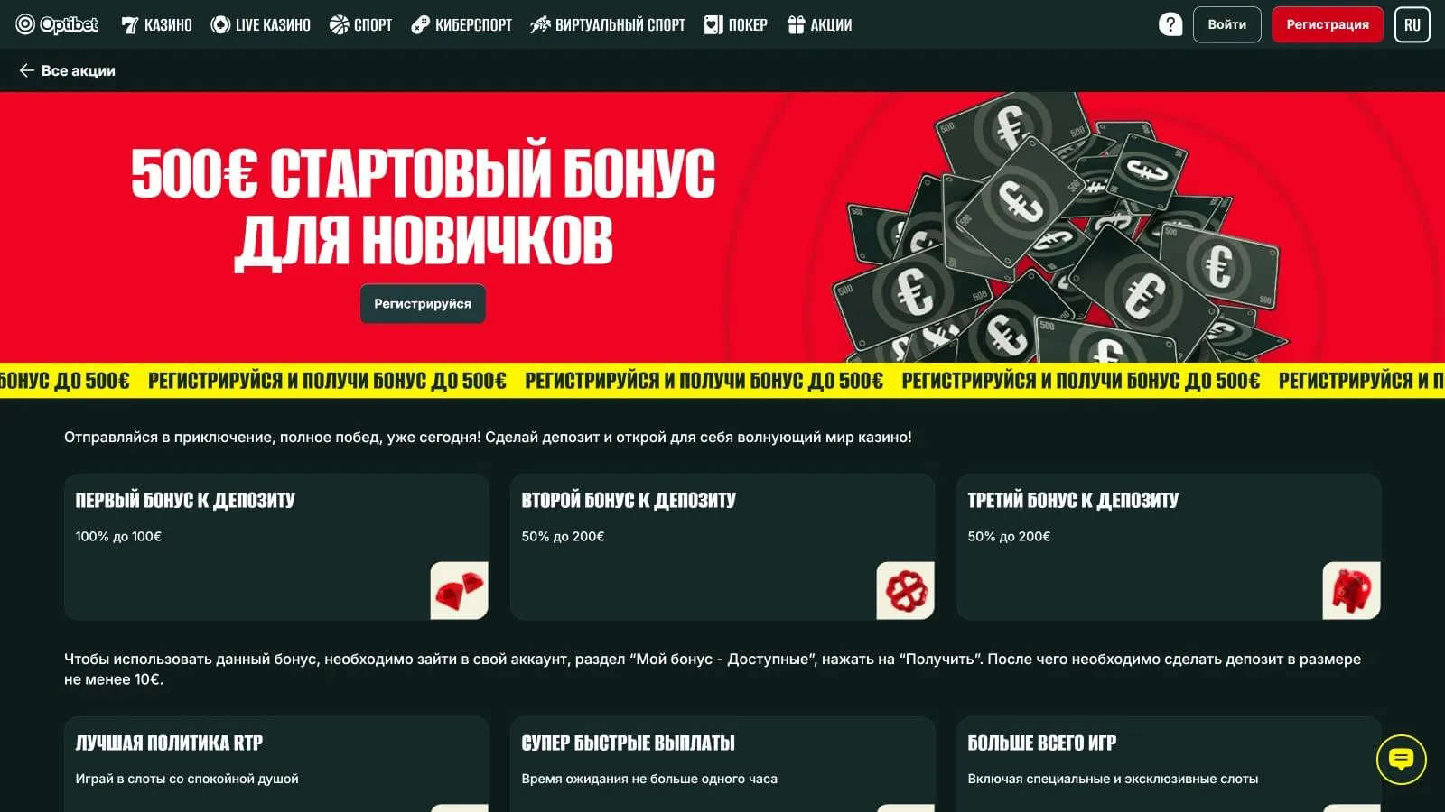 Каждый месяц на Optibet появляются новые акции с бонусами выше среднего. Все игроки автоматически участвуют в VIP-программе, где накопленные баллы можно обменять на реальные деньги. Помимо бонусов казино, на сайте представлены привлекательные спортивные акции: безрисковые ставки и различные беттинг-конкурсы, позволяющие выиграть дополнительные средства.
