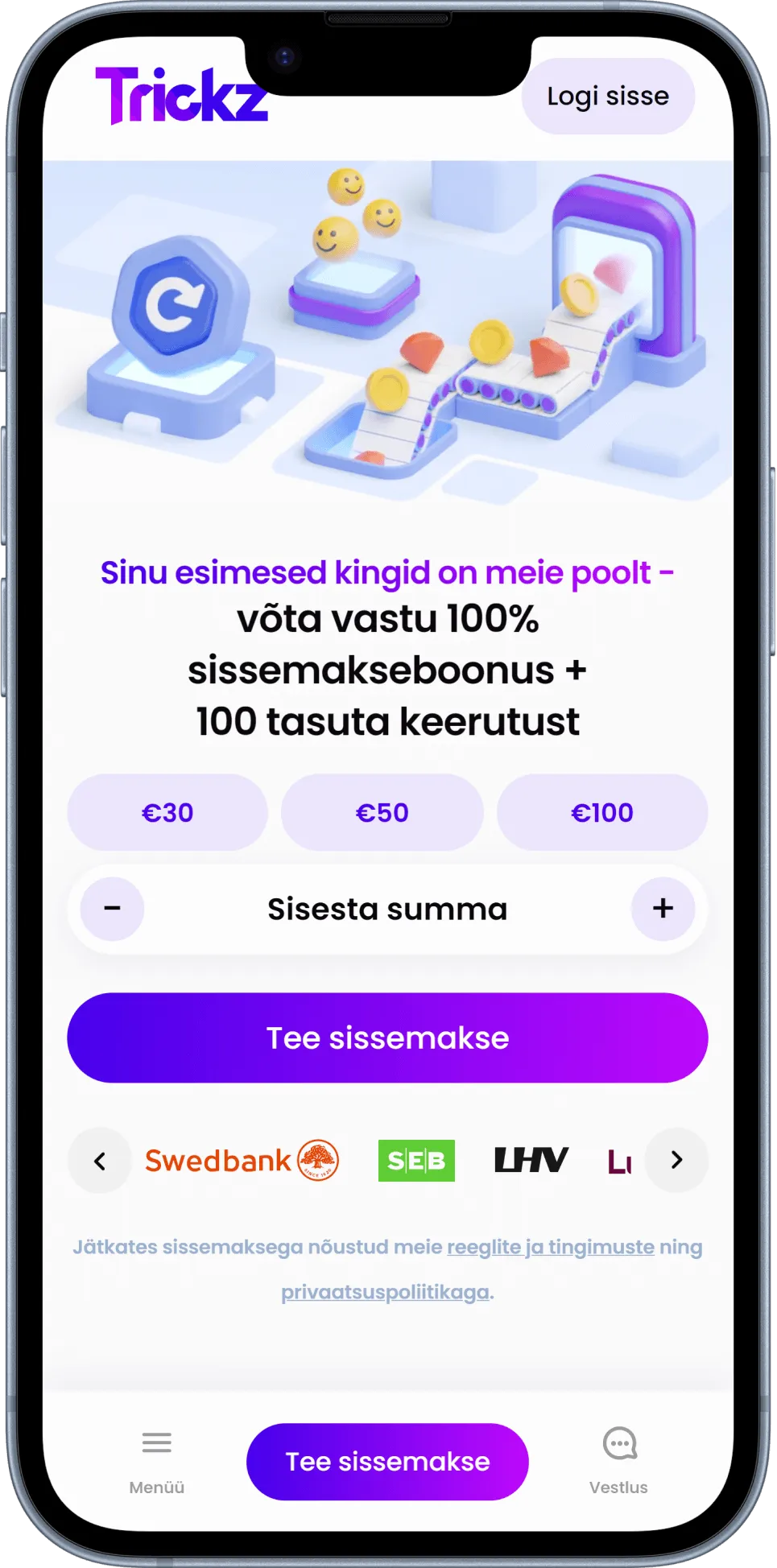 Казино позволяет игрокам безопасно вносить и выводить средства через платёжный сервис Trustly. Поэтому у вас должна быть учётная запись в одном из эстонских интернет-банков — SEB, Swedbank, LHV, Luminor, Revolut, Coop, Citadele или Luminor