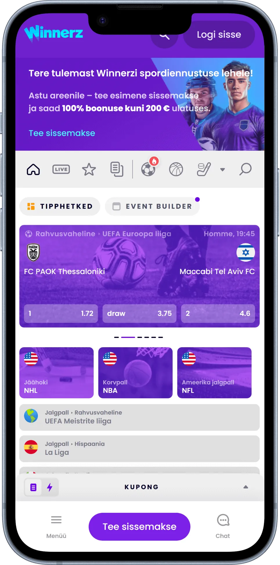 Приветственный бонус на спорт от Winnerz: 100% до €200: