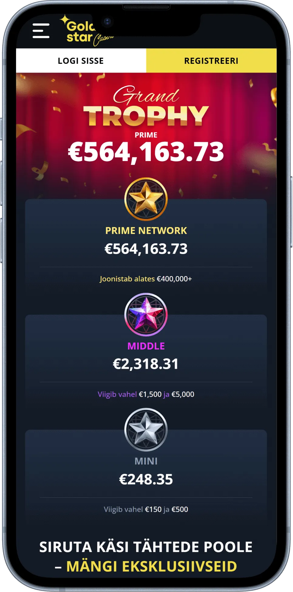 Siit leiate suure valiku erinevaid mänge mitmete jackpotidega, nagu Megaways, Drops & Wins, aga ka mitmeid progressiivseid jackpote, kus võib iga keerutusega oodata suuri võite. Mis tähendab, et Golden Star kasiinos on võimalik iga päev külvata endale auhindu ja hea fortuuna korral tõusta uutesse jackot kõrgustesse.