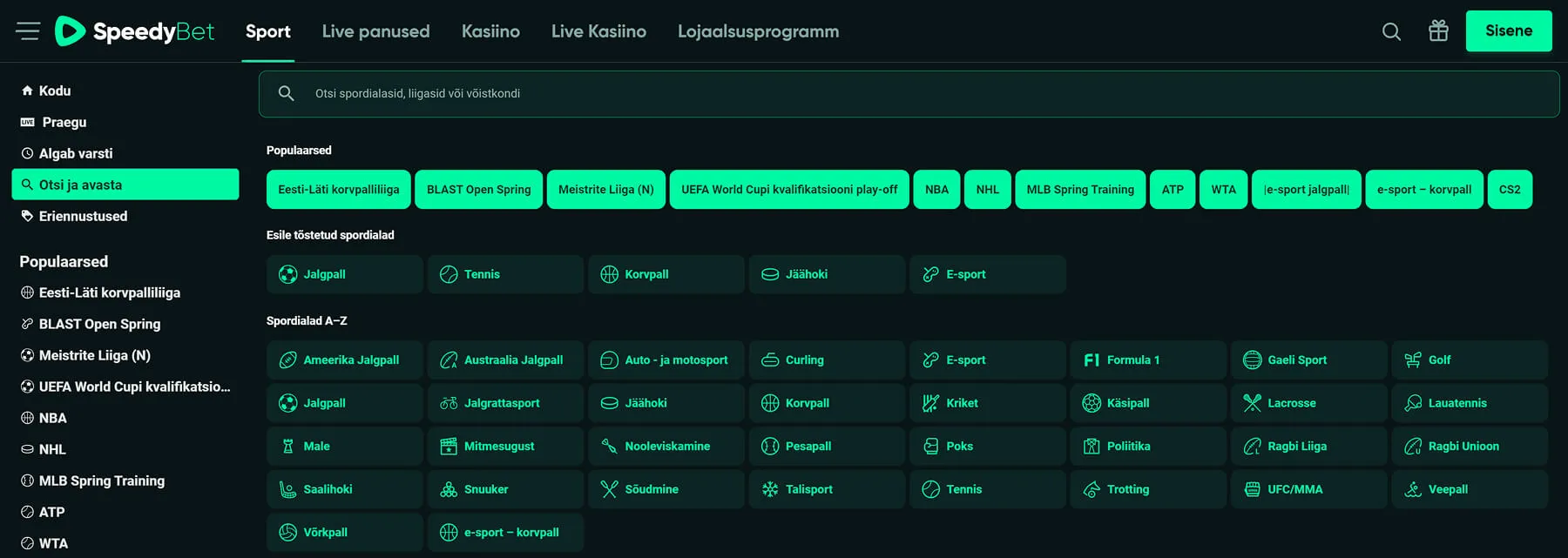Põhinavigatsioonist on teile kättesaadaks tehtud mängueelsed kui ka live sündmused viidetega Sport ja Live panused. Mängueelsete spordialade hulgas on jalgpall, korvpall, jäähoki, tennis - kokku üle 35+ võimaluse.
