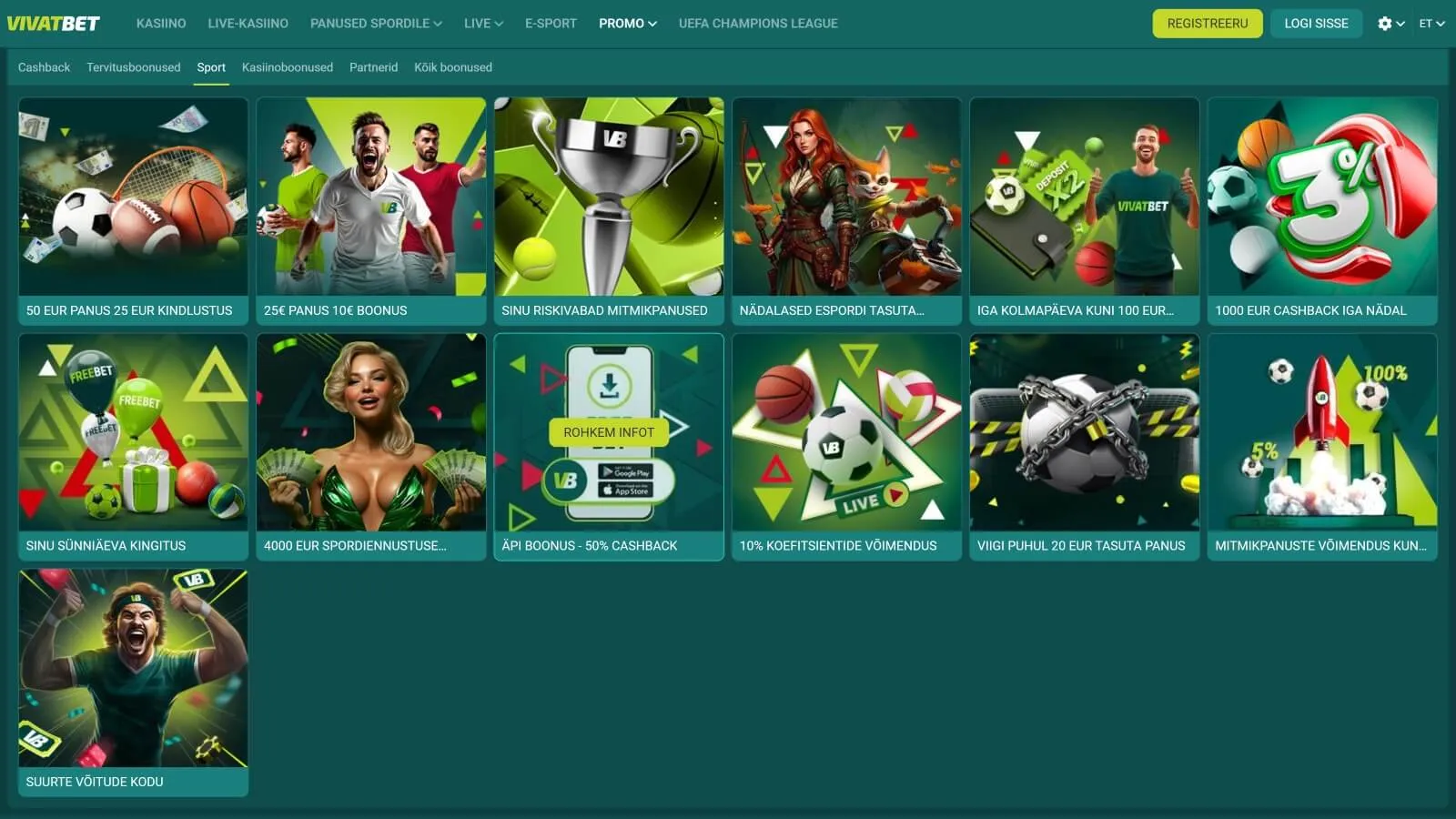 Kogu Vivatbet spordiennustuse kampaaniate ja boonuste valiku leiate, kui avate põhinavigatsioonist viite Promo. Teie ees avaneb kirju nimekiri kõikvõimalikest erinevates boonustest, kuna lisaks spordiennustusele pakub Vivatbet ka kasiino slotikaid ja live diileriga laudu. Mugavamaks ülevaateks on Vivatbet loonud ka eraldi tootepõhise alajaotuse.