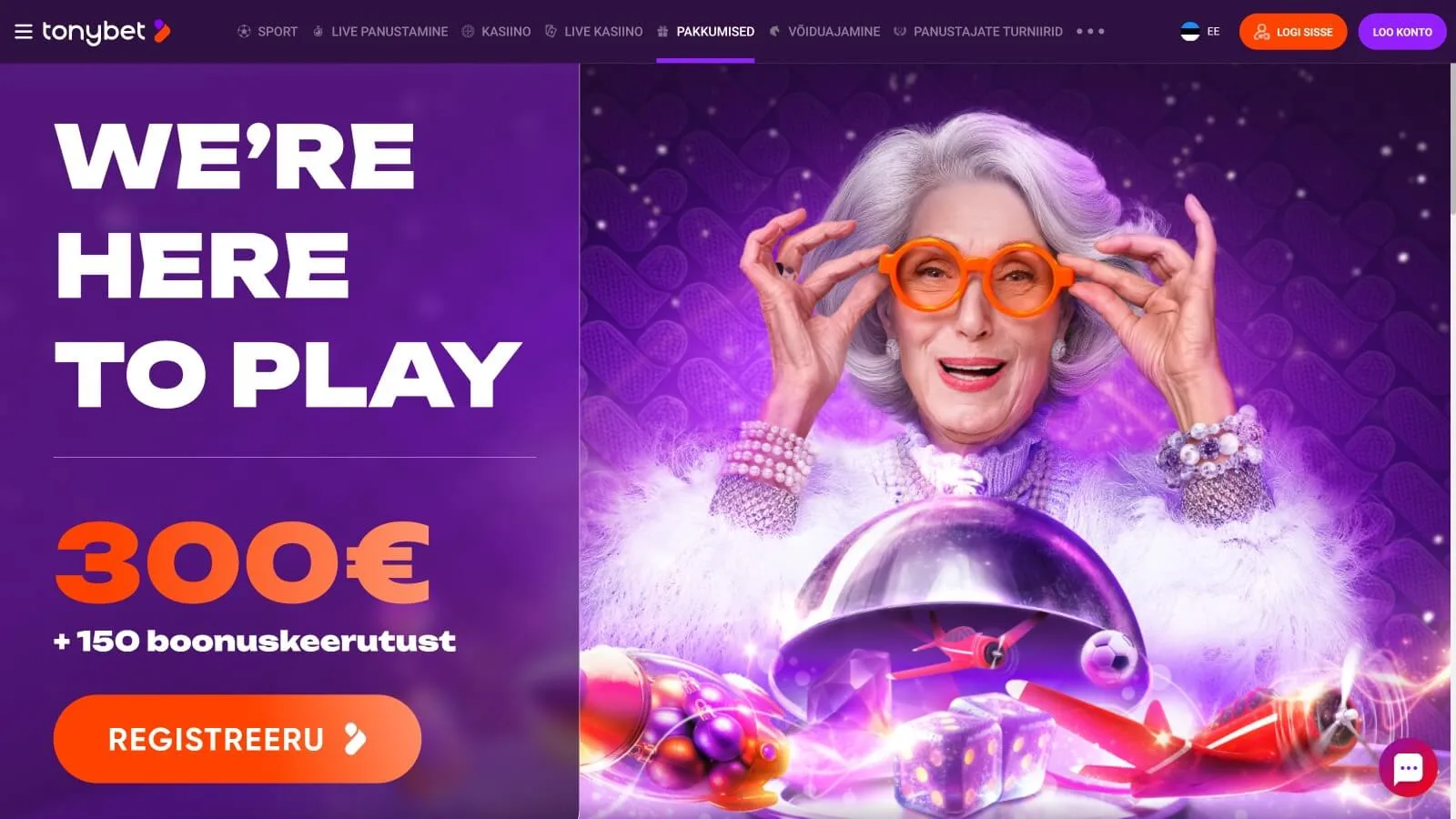 Kui sa oled Tonybetis uus, siis on just nüüd õige aeg konto luua ja proovida kõiki nende uusimaid võimalusi. Lihtsalt loo konto kohe ja saad esimese sissemaksega Tonybeti tervitusboonus - 100% kuni €150 + 100 tasuta spinni.
